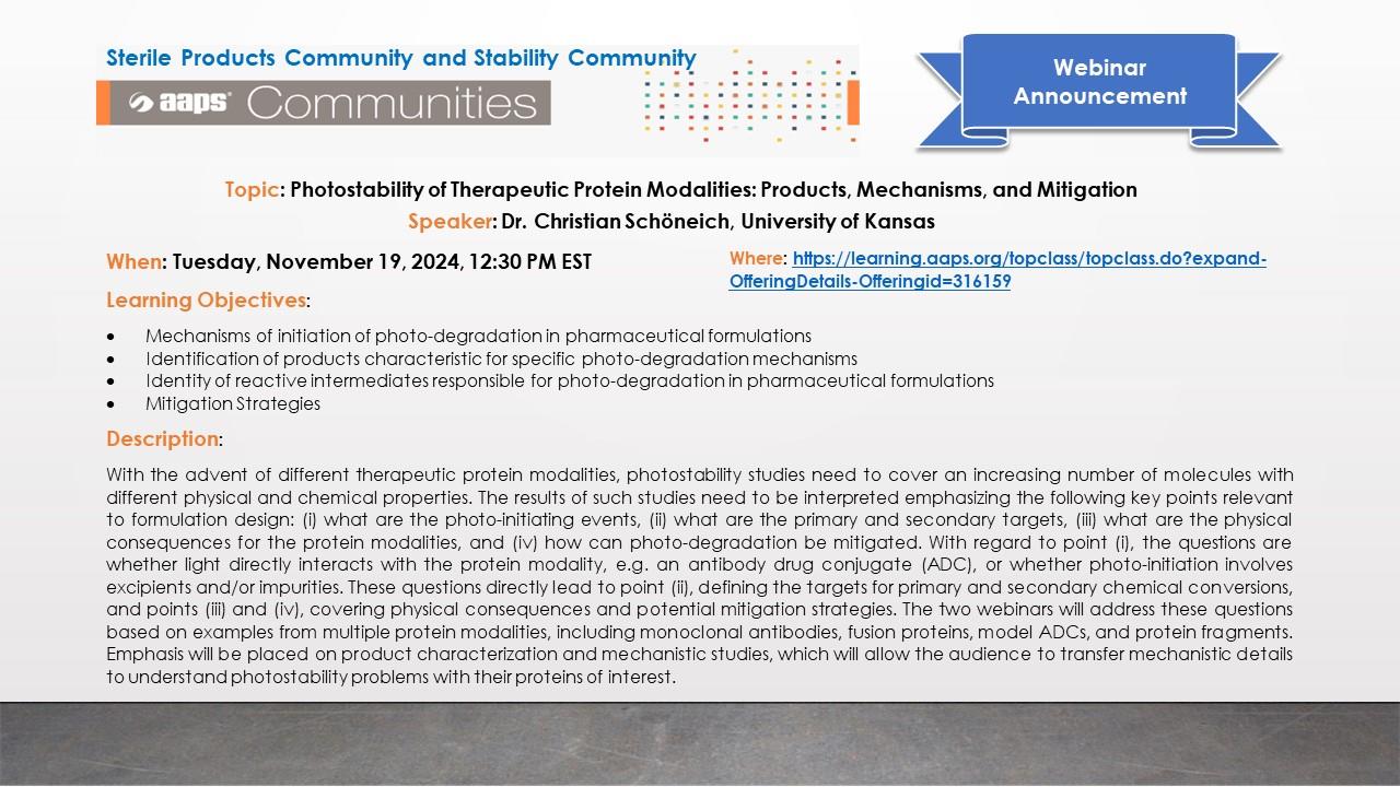Dear Community, Please attend the joint SPC and Stability community webinar, on   "Photostability of Therapeutic Protein Modalities: Products, Mechanisms, and Mitigation" by Prof. Schöneich from University of Kansas.