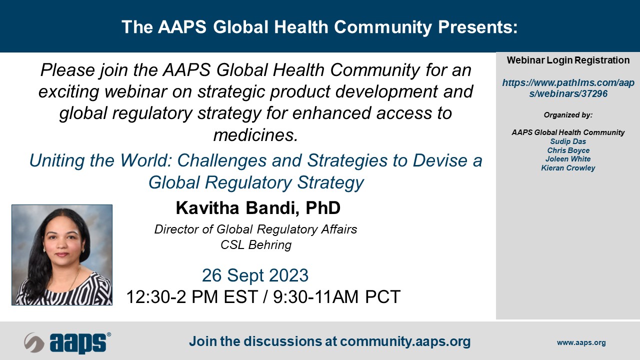 Please join the AAPS Global Health Community for an exciting webinar on strategic product development and global regulatory strategy for enhanced access to medicines: