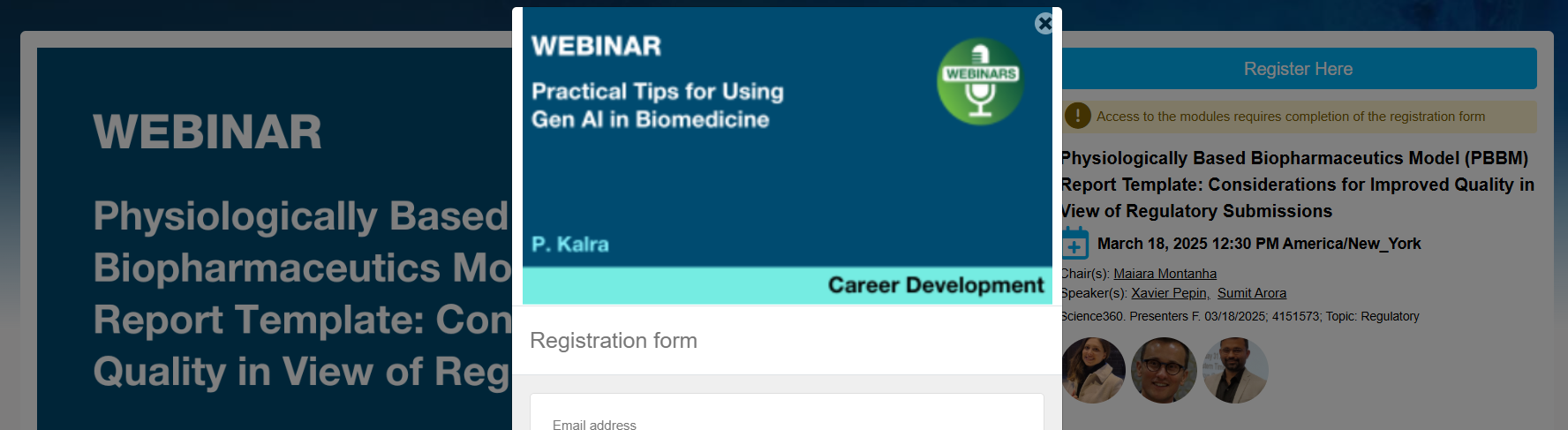 Hi Benjamin. Thanks for your message. This morning I also had the same box pop up with information for with Gen AI webinar instead of the PBBM webinar. However, I did get an email confirmation for the correct, PBBM webinar from Science360<[email protected]>. Please checked your spam folder to see if you indeed received a confirmation email. In the meantime, I am checking in with AAPS and will let you know what I find out. Kind regards, Deanna